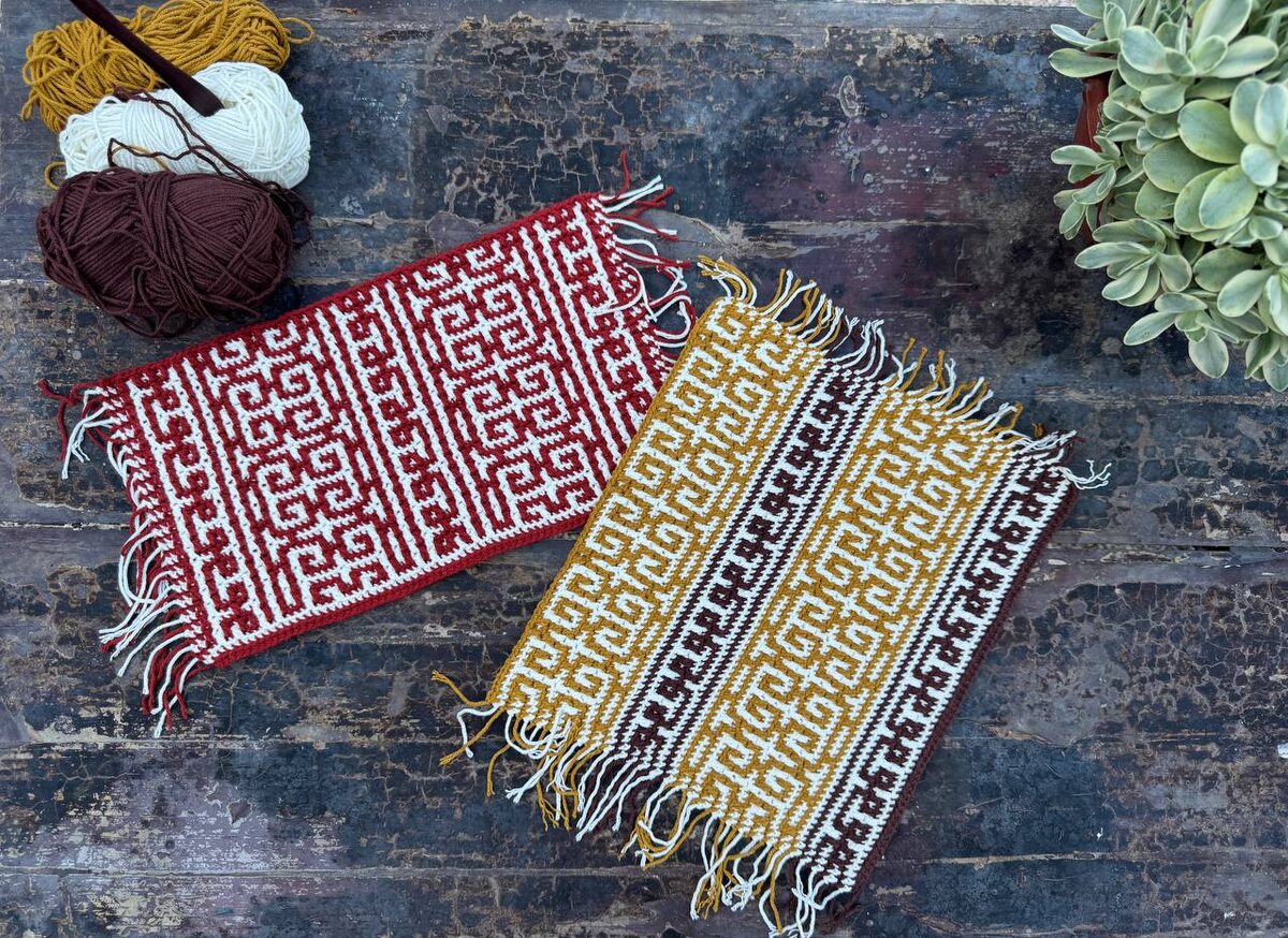 Горизонтальные и вертикальные узоры Давайте поговорим про направление узора. Для разных проектов нам нужно, чтобы орнамент шел то горизонтально, то вертикально — и в наших силах этим процессом управлять. И даже цветом мы можем подчеркнуть или наоборот пригасить границы полос. Пример: нам нужно связать ковер-дорожку так, чтобы бахрома была по узким сторонам, а рисунок был ей перпендикулярен. Или мы хотим связать наволочку для подушки с вертикальными полосками узора, да еще и отличающимися по цвету. Все это возможно — нужно просто повернуть схему и вязать ее поперек. На фото вы видите два образца с одинаковым узором, но один выполнен в одной паре цветов и связан вертикально (бахрома по широким сторонам), а другой связан с переходом цвета и горизонтально (бахрома по узким сторонам). Разумеется так же можно вязать и по кругу. Такому повороту поддается почти любая схема, кроме узких классических (узкие ромбы, например) и узких вафельные (те же вафельные ромбы). Просто помните о такой