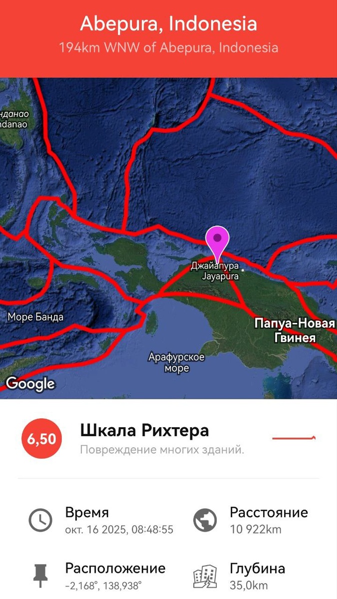 В ответ на пост Согласно прогнозу от 12 октября произошло сильное землетрясение М6.5 в западной части Папуа Новой Гвинеи. Увы, но ночная аномалия в VLF привела к еще одному землетрясению М6+ мире, помимо М6.3 в проливе Дрейка. ===== According to the forecast of October 12, a strong earthquake M6.5 occurred in the western part of Papua New Guinea.