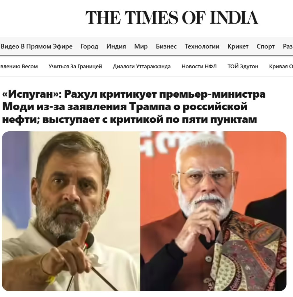 «Премьер-министр Моди боится Трампа. 1. Позволяет Трампу решать и объявлять, что Индия не будет покупать российскую нефть. 2. Продолжает отправлять поздравительные сообщения, несмотря на неоднократные пренебрежительные высказывания. 3. Отменил визит министра финансов в Америку. 4. Пропустил Шарм-эль-Шейх. 5. Не возражает ему по поводу операции «Синдур».