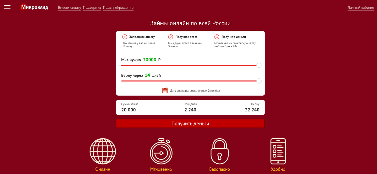 Оформление заявки на микрозайм через сервис Микроклад занимает всего несколько минут. Потребуется всего лишь доступ в интернет и мобильный телефон. На сайте выбираете нужную сумму и срок займа, затем заполняете анкету с личными данными. На ваш телефон придет код для подтверждения заявки. После этого сервис рассматривает заявку, обычно это занимает не более 15 минут, и при положительном решении деньги зачисляются на указанный счет или карту.