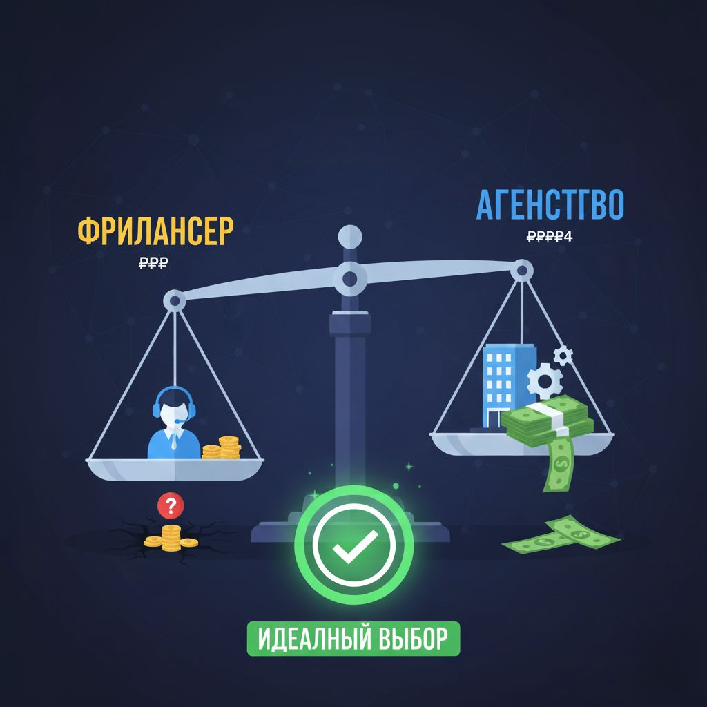 Выбор, который всегда кажется проигрышным Вы решили делегировать настройку рекламы и столкнулись с дилеммой. Ваш главный страх — потерять деньги и время. Вы хотите низкий CPL (стоимость лида) и контроль бюджета, но кажется, что ни один из вариантов не может этого гарантировать. Разберу плюсы и минусы каждого типа подрядчика и покажу, как найти золотую середину — формат работы, который даст вам стратегическую глубину агентства и персональную заинтересованность эксперта. Агентство — это крупная машина с отлаженными процессами. Вы платите за их масштаб, но часто становитесь жертвой бюрократии. В агентстве вы теряете прямую связь с человеком, который принимает критические решения по вашему бюджету. Это повышает риск слива денег из-за равнодушия (вспомните наш Кейс по B2B-вентиляции!). Фрилансер — это одинокий игрок. Он может быть талантлив, но его работа всегда нестабильна и рискованна. Отсутствие Аварийного Протокола. Если что-то идет не так, вы остаетесь один на один с горящим рекламным