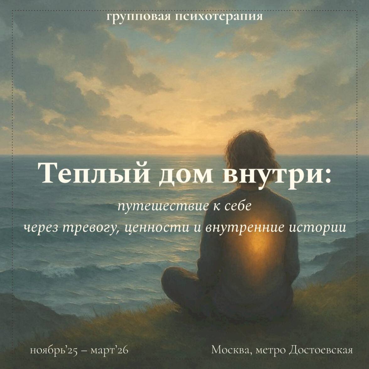 про групповую терапию тревоги привет, друг! ты читаешь мой канал уже не первый месяц, а может, и не первый год. ты знаешь, сколько я писала о тревоге — от механизмов в мозге до телесных зажимов. и, я думаю, ты узнавал в этих текстах себя! и теперь я хочу пойти с тобой дальше: от знаний о тревоге к свободе от нее! 🕊️ я хочу провести тебя не просто «знанием о тревоге», а живым, телесным, глубоким опытом. чтобы то, о чем мы столько говорили, стало не просто информацией, а твоим внутренним состоянием. чтобы у тебя внутри появилось то, что не смогут забрать внешние обстоятельства, — твой собственный «тёплый дом» 🏠 «Теплый дом» — это 4 месяца очной бережной групповой терапии, где мы шаг за шагом будем выстраивать твою опору через методы, которым я доверяю (КПТ, ДБТ, схема-терапию, телесно-ориентированную, терапию самосострадания), через искреннюю поддержку группы и моё сопровождающее присутствие. если ты готов перестать бороться с собой и готов начать жить, чувствую себя дома и в теле