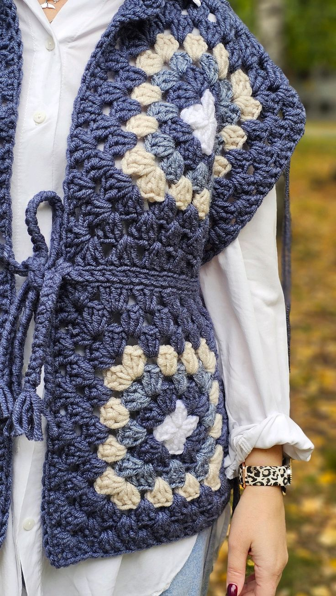 Жилеты и жакеты из очень крупных бабушкиных квадратов