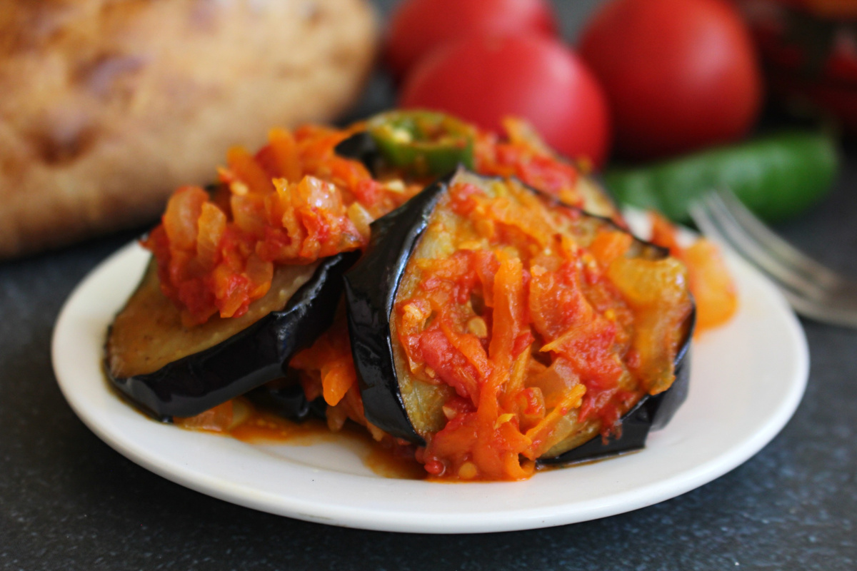 Это очень аппетитная закуска, которая порадует любителей жареных баклажанов. Такую закуску можно сразу подать к столу в горячем виде, а можно охладить, в обоих случаях будет вкусно! Закуска получается сочная, остренькая, яркая, с легкой кислинкой. Количество овощей для зажарки можно менять, добавить больше или меньше моркови, лука, смотря что нравится. Острый перец - по желанию, если любите. Зелень тоже можно добавить - если любите. Из этого количества ингредиентов получается много, но когда такие жареные баклажаны постоят, они становятся только вкуснее и съедаются они быстро. Баклажаны - 1.5 кг. Лук репчатый - 900 г. Помидоры - 800 г. Морковь - 600 г. Чеснок - 1 головка Перец острый - по вкусу Сахар - 1 ч.л. Соль - по вкусу Масло растительное - для жарки Баклажаны нарежем не очень тонкими кружочками и обжариваем их до румяного цвета с двух сторон на сковороде с разогретым маслом. Жареные баклажаны выкладываем, затем их будем перекладывать слоями в посуду с крышкой, в которой они будут