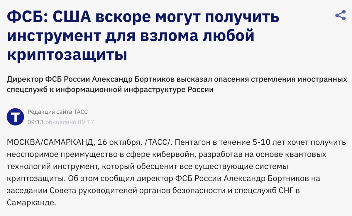 Глава ФСБ: США в течение 5-10 лет могут получить инструмент для взлома всех систем криптозащиты.