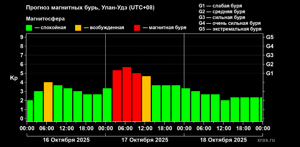 Вероятность магнитной бури 16 октября составляет 80%, 17 октября - 56%. С большой долей вероятности волнения будут на уровне G2, что относится к средней магнитной буре.