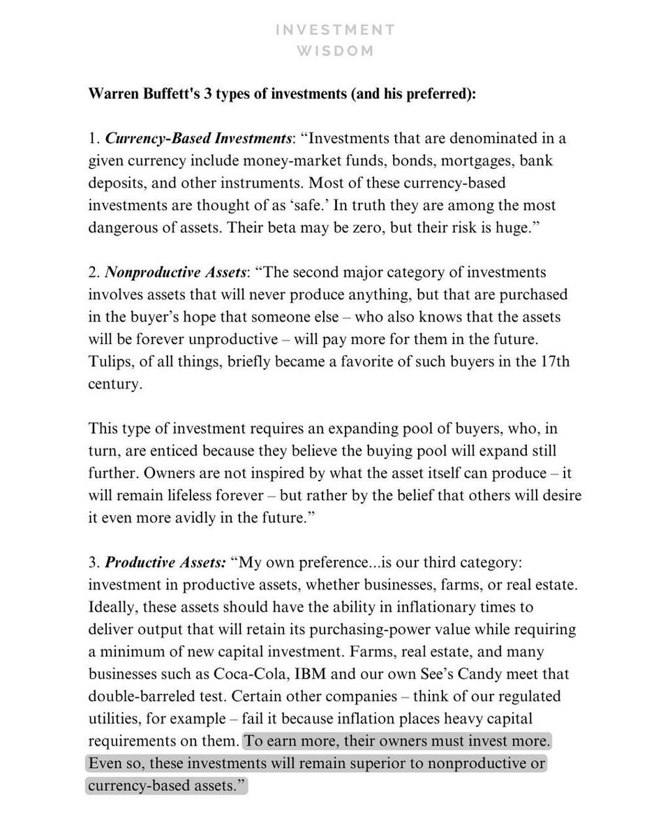 Три типа инвестиций по Баффету — и почему большинство застревает во втором Баффет делит все активы на три группы: 1. Валютные — деньги, облигации, депозиты. То, что кажется «безопасным». Но именно они обесцениваются быстрее всего, потому что зависят от эмиссии. Это иллюзия стабильности — риск без волатильности. 2. Непроизводительные — золото, картины, биткоин. То, что ничего не производит, но растёт из-за веры в то, что кто-то купит дороже. Баффет относился к ним скептически, но в эпоху обесценивания валют именно этот тип стал защитой от безумия денежной политики. 3. Производительные — бизнесы, фермы, недвижимость. То, что создаёт ценность, адаптируется, генерирует поток. Баффет делает ставку именно сюда, потому что такие активы способны пережить инфляцию, войну, технологический сдвиг. Ирония времени в том, что сегодня биткоин постепенно двигается из второй категории в третью. Через DeFi, Lightning, ETF и инструменты на его базе он начинает создавать — обеспечивать кредит, ликвид
