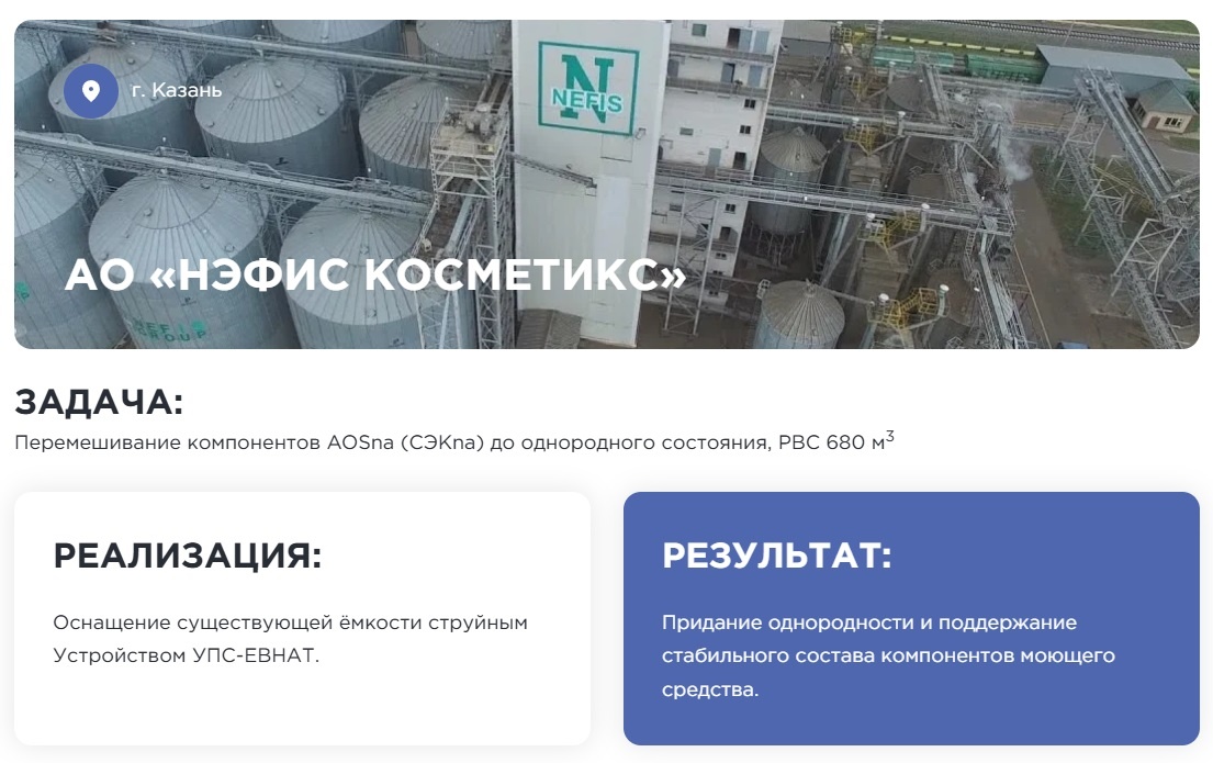 Качество моющего средства — ключевой показатель, определяющий его эффективность и конкурентоспособность на рынке. Одним из важнейших факторов, влияющих на качество конечного продукта, является однородность состава. При хранении компонентов в резервуарах возникает серьезная проблема расслоения, которая приводит к нестабильности характеристик готового продукта. Расслоение компонентов при хранении в резервуарах вертикального типа (РВС) — распространенная проблема в производстве моющих средств. Неоднородность состава приводит к следующим негативным последствиям: Для решения проблемы расслоения компонентов предлагается установка струйного перемешивающего устройства УПС-ЕВНАТ в существующий резервуар РВС объемом 680 м³. Эжекторное перемешивание — основа работы устройства. Уникальная технология позволяет одному объему подаваемой жидкости обеспечивать циркуляцию четырех объемов продукта, что гарантирует эффективное перемешивание всего состава. Ключевые достоинства УПС-ЕВНАТ: Внедрение устрой