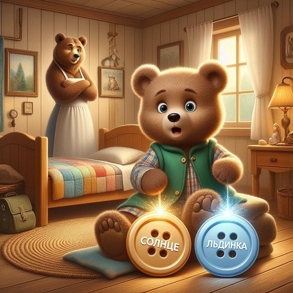 В уютном домике на опушке леса жил-был маленький медвежонок по имени Миша. Миша был замечательным медвежонком: добрым, любознательным и очень весёлым. Но был у него один секрет, известный всем обитателям леса, — Миша терпеть не мог одеваться. Как только мама говорила: «Мишенька, пора на прогулку, нужно надеть жилетку!» — медвежонок будто превращался в каменного. Он уползал под стол, прятался за диваном или делал вид, что очень крепко спит. — Ох, уж это одевание! — вздыхала мама. — Это же так скучно! Но однажды бабушка-медведица, которая была большой мастерицей и знала кое-что о волшебстве, принесла Мишиной маме маленькую коробочку. — Пришей эти пуговицы на его новую жилетку, — сказала бабушка, подмигнув. — Увидишь, всё изменится. Мама так и сделала. Она пришила на зелёную бархатную жилетку две необычные пуговицы. Одна была похожа на маленькое солнышко и переливалась золотым светом. Другая — на льдинку и сияла холодным голубым блеском. Наступило утро. «Миша, одеваться!» — позвал