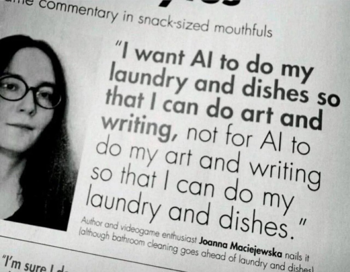 «Я хотела чтобы ИИ занимался стиркой и посудой пока я рисую и пишу — а не чтобы ИИ рисовал и писал пока я стираю и мою посуду»