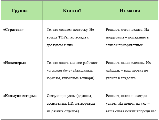 Признаемся честно: миллениалы уже давно поняли, что усердный труд и KPI — это необходимый, но жалкий минимум. Это как иметь спасательный круг, но без билета на яхту. Настоящий карьерный драйв начинается, когда вы находите тех, кто эту яхту действительно ведет. Это не про интриги. Это про социальный капитал. Введите в свой лексикон термин «экономически устойчивая группа» (ЭУГ). Это неформальное объединение сотрудников, которое реально влияет на распределение ресурсов, принятие решений и, что важно, на карьерные траектории. Они — нервный узел компании. Ваша задача — стать в этом узле не вирусом, а нейроном. Инструкция по инфильтрации (с сохранением достоинства). Для начала — карта местности. Различаем три ключевых ЭУГ, с которыми вам предстоит иметь дело. Шаги к симбиозу (а не к паразитизму): Почему это сработает? Потому что вы меняете парадигму. Вы не «строите карьеру», вы «формируете экосистему взаимовыгодного профессионального обмена». Вы не просите — Вы предлагаете симбиоз. В мире,