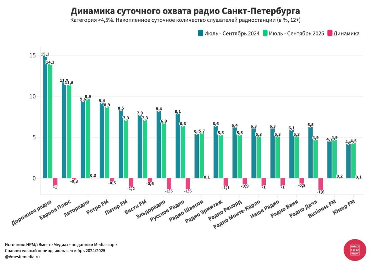 *по данным Mediascope Сравнительный период: Июль - сентябрь 2024/2025 В исследовательскую группу Mediascope за год добавлено 3 радиостанции: Relax FM, Радио Джаз и Радио МИР. ➡️ В топ-5 радиостанций по суточному охвату в 2025 входят: Дорожное радио, Европа Плюс, Авторадио, Ретро FM и Питер FM. ➡️ наибольший 📈 прирост суточного охвата в отчетном периоде у Радио Sputnik (+0,8), Авторадио (+0,3), Детское Радио (+0,3), Радио Звезда (+0,3) и Like FM (+0,3) ➡️ наибольшее 📉 падение суточного охвата отмечается у радиостанций: Радио Дача (-1,6), Русское Радио (-1,5), Эльдорадио (-1,5), Питер FM (-1,2) и Радио Эрмитаж(-1,1) ▫️Категория радиостанций с накопленным суточным количеством слушателей радиостанции больше 4,5%: (смотреть на графике) 1. Дорожное радио - 14,1 (📉-1) 2. Европа Плюс - 11,6 (📉-0,3) 3. Авторадио - 9,9 (📈+0,3) 4. Ретро FM - 8,9 (📉-0,5) 5. Вести FM - 7,3 (📉-0,6) 6. Питер FM - 7,3 (📉-1,2) 7. Эльдорадио - 6,9 (📉-1,5) 8. Русское Радио - 6,6 (📉-1,5) 9. Радио Шансон - 5,7 (?