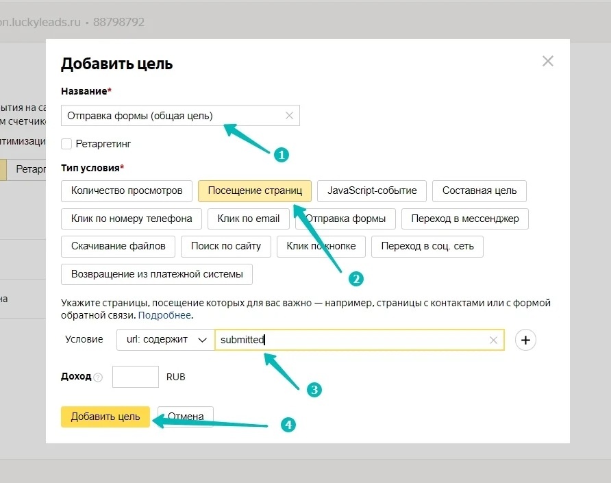 Посещение страниц → url содержит: submitted Откуда берется это условие?
