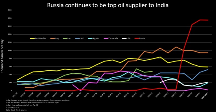 Доля российских поставок в структуре импорта Индии стала ниже в текущем финансовом году, составляя 36%. По данным правительства, за период с апреля по сентябрь, то есть за первые 6 месяцев финансового года, Индия импортировала 1,75 миллиона баррелей российской сырой нефти в день, при этом ее доля снизилась примерно до 36% от общего объема импорта нефти в Индию с 40% за тот же период годом ранее. Импорт сырой нефти из США в Индию вырос на 6,8% в годовом исчислении до ~213 000 баррелей в сутки, что составляет 4,3% импорта. Доля ближневосточной нефти за тот же период выросла с 42% до 45%. Импорт нефти в Индию. Индия и Китай являются двумя крупнейшими покупателями российской сырой нефти, экспортируемой морем. Они пользуются скидками, на которые Россия была вынуждена согласиться после того, как европейские покупатели отказались от закупок, а США и Европейский союз ввели санкции. Президент США Дональд Трамп накануне заявил, что премьер-министр Нарендра Моди заверил, что Индия прекратит покуп