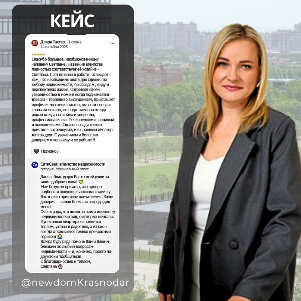 ⭐️ Кейс. Подбор квартиры для клиента Ко мне обратилась Данна — в тот момент она только начинала подбирать варианты для покупки квартиры. Как часто бывает, было много вопросов: где лучше купить, на что обратить внимание, как всё правильно оформить. Я помогла разобраться во всех нюансах — от выбора локации и застройщика до оценки перспектив района. Мы вместе рассматривали разные варианты и выезжали на показы. 📌 Моя цель всегда одна — чтобы клиент чувствовал себя спокойно и уверенно на каждом этапе. Сделка прошла легко и комфортно, а самое приятное — спустя время Диляра оставила отзыв, где отметила, что процесс покупки прошёл без стресса, а квартира полностью оправдала ожидания. Такие слова — лучшая награда за мою работу 💛 Когда клиенты становятся друзьями и рекомендуют меня дальше — значит, всё сделано правильно 🙌 💎 Хотите также? Жду вас на бесплатной консультации 😊 ________ #светланашаповал #домакраснодар #участкикраснодар #новостройкикраснодар #квартирыкраснодар