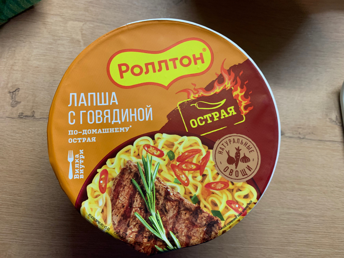 Увидал вчера в одном сетевике, изначально заточенном на продажу горячительных напитков. Навялил давеча курицы много, вот зашел за пенным к ней, а тут - такое. Больше не пока нигде не встречал, пройти мимо, разумеется, не смог. 90 граммовый стакан за 99 рублей. Срочно пробовать, решил я. По составу это типичный Роллтон, и Чили тут совсем не на первом месте. Мне лично очень нравится их линейка «с огоньком», острота в самый раз. Посмотрим, как себя покажет данный продукт. В стакане имеется стандартный набор: шайба лапши, сухие овощи, пакет с приправой. На вкус она не острая почти. Вилка какая-то широкая, почти плоская. Сразу понятно, что неудобная совершенно. Способ приготовления обычный: все в стакан, кипяток, кушаем. Я еще туда нарезал вяленой курицы, для нажористости. Нууууу, кагбе, нет. Вот совсем нет. Лапша разварилась и размякла, будто я ее минут на 10 оставил. Остротой И вкусом бульона почти не пропиталась. Вата какая-то, короче. Бульон - бледная тень красного дошика. Цен