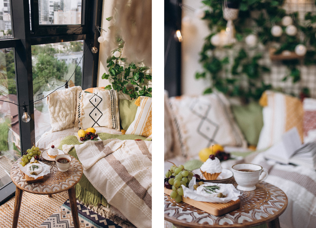 С наступлением осени так хочется тепла! Отличной идеей станет обустройство балкона — вашего личного уютного уголка для отдыха. Рассказываем, как преобразить его всего за несколько шагов. Обратите внимание на натуральные материалы: дерево, ротанг, гиацинт. Они не только устойчивы к капризам погоды, но и на ощупь кажутся особенно тёплыми. В зависимости от метража, для компактного балкона хватит пары табуретов и кофейного столика, а для просторного подойдут уютные кресла или диванчик. На фото: белая наволочка, наволочка с ромбами, белый плед, кофейный столик, искусственная лиана, гирлянда, доска для подачи. Мягкие ткани делают обстановку более расслабленной и комфортной. Несколько уютных пледов из хлопка или кашемира и декоративные подушки в вязаных или вельветовых чехлах создадут нужную атмосферу. Выбирайте осенние цвета: терракотовый, горчичный, приглушённый оранжевый или бежевый. На фото: белая наволочка, наволочка с ромбами, белый плед, кофейный столик, искусственная лиана, гирлянда,