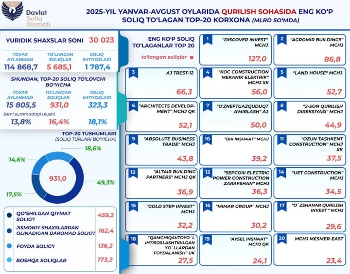 Отмечается, что наибольший вклад в поступления обеспечили 20 крупнейших налогоплательщиков, сумма уплаченных ими налогов составила 931 млрд сумов, что соответствует 16,4% от общего объема налоговых поступлений строительного сектора. При этом общий товарооборот этих организаций превысил 15,8 трлн сумов, а применяемые ими налоговые льготы составили 323,3 млрд сумов, что свидетельствует о масштабной экономической активности и эффективности работы крупных компаний отрасли.