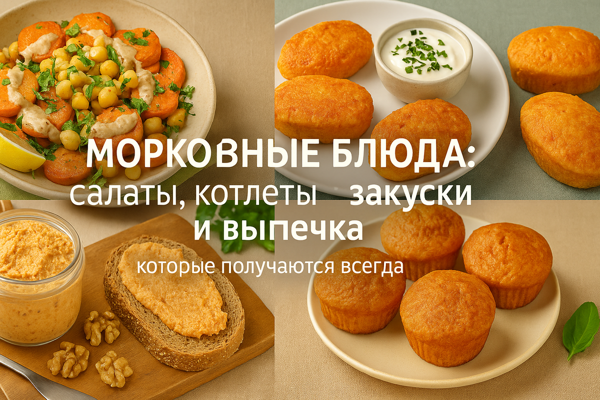 Тёплый салат из моркови с нутом и тахини, сочные морковные котлеты без яиц, быстрый паштет с грецкими орехами, булочки «как из пекарни» и супер-влажные маффины на кефире. Всё — из доступной моркови, с чёткими граммами и понятными таймингами. Жмите — забирайте проверенную подборку на каждый день! 🥕✨