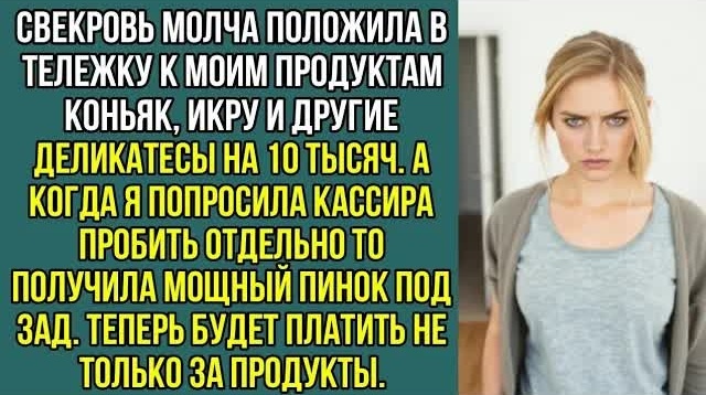 Свекровь стояла рядом, будто королева. Спина прямая, подбородок поднят. Она с интересом наблюдала, как на экране кассы растёт сумма, и даже улыбалась, когда кассир пробивала очередной деликатес. Казалось, ей доставляет удовольствие, что всё это оплачиваю я.