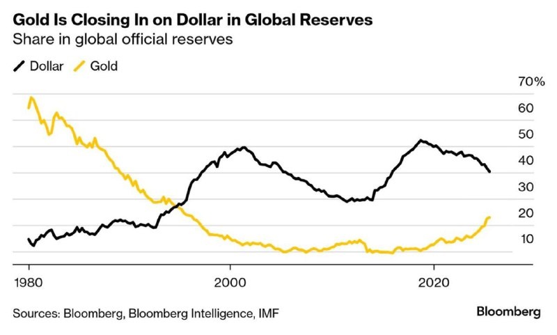 В глобальных официальных резервах заметен исторический сдвиг: доля золота растёт, а доля доллара падает. Доллар после пика около 70% в 2000-х сейчас опустился ниже 60%, а тренд остаётся нисходящим. Золото с минимумов 2000-х (~10%) подросло до почти 20%, максимально сблизившись с долларом за последние 50 лет.