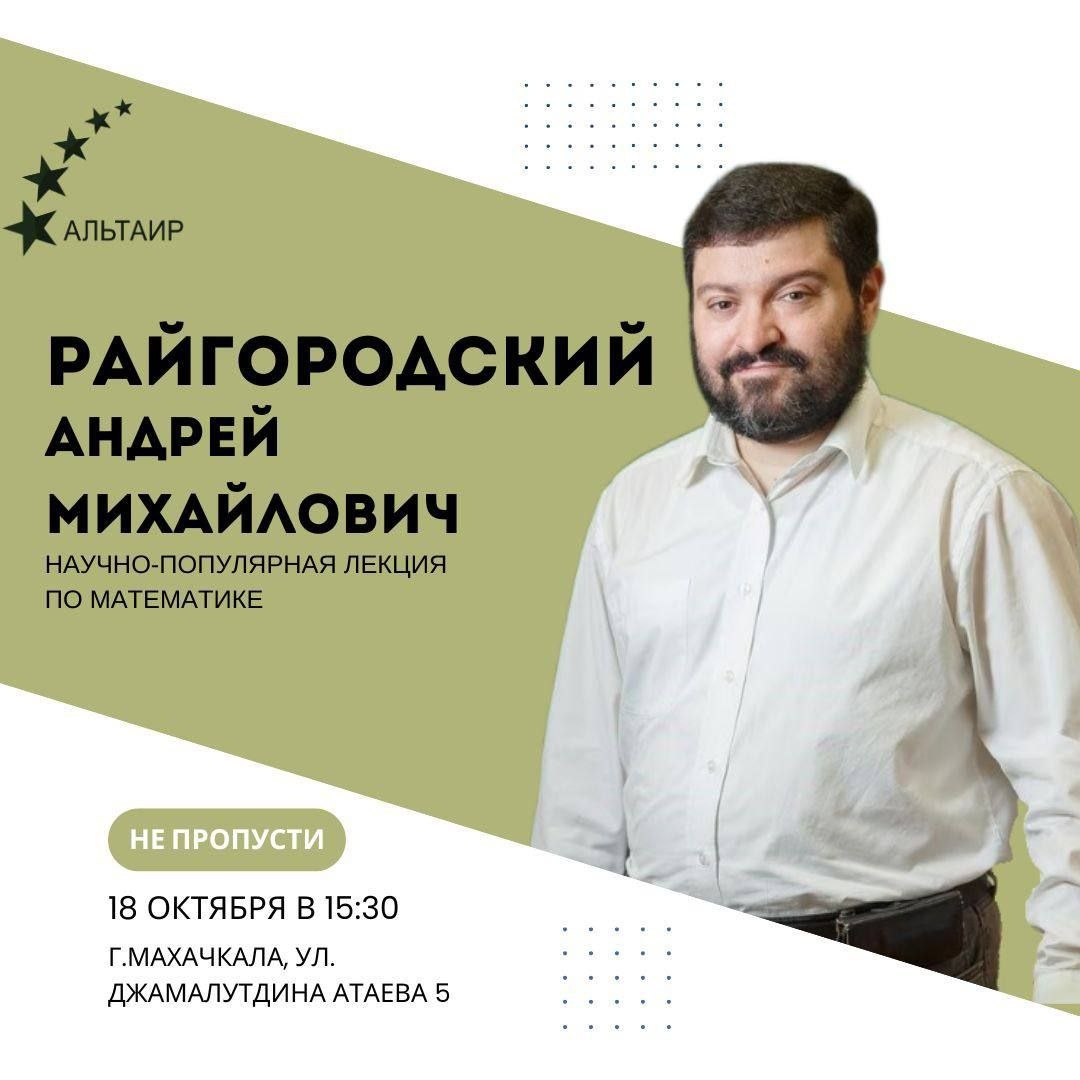 Для всех, кто любит математику! 📢18 октября в 15:30 Центр развития талантов «Альтаир» приглашает всех увлечённых школьников и студентов на встречу с одним из ведущих учёных страны — Андреем Райгородским! Андрей Михайлович — имя, хорошо известное в академическом и образовательном сообществе. Он — директор Физтех-школы прикладной математики и информатики МФТИ, заведующий кафедрой дискретной математики, федеральный профессор, а также автор множества совместных научных проектов с компанией «Яндекс». ✅Это возможность услышать о современных направлениях математики и узнать, как развиваются теории, которые формируют будущее технологий и науки. Лекция будет особенно интересна школьникам, увлечённым олимпиадным движением, а также всем, кто хочет заглянуть за рамки привычных задач и увидеть живую, настоящую математику. Где: город Махачкала, ул. Джамалутдина Атаева, д. 5, ДГУНХ Когда: 18 октября, начало в 15:30 ❕Участие в лекции по предварительной регистрации по ссылке: https://forms.yande