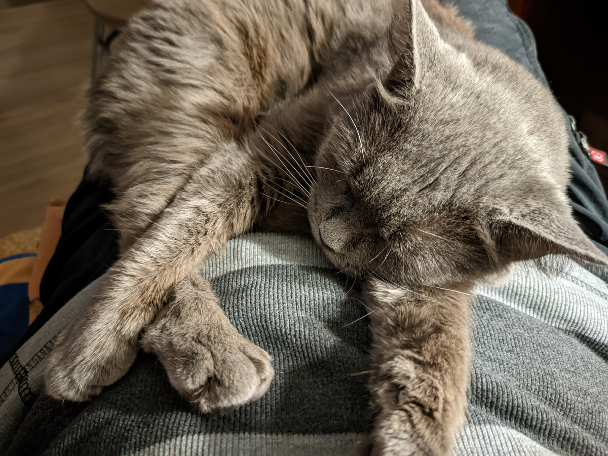 Вечером с Дымкой готовились к сегодняшнему судебному заседанию. Хотя, чего там готовиться, я уже наизусть всё выучил и тут просто бумажки важные с места на место перекладываешь и в стопочку их укладываешь, в сумку нужные кладёшь, вот и вся подготовка. Главное музыку не забывать послушать. Энергичную, для дела. Утро началось с солнечной погоды. На фото как раз солнце за облака на ненадолго спряталось. Времени было предостаточно, отдыхал, набирался сил. Позавтракал макаронами с яйцом. Пришла Дымка и тоже приняла участие в моем завтраке. Посмеялся, дал ей макаронину. Съела, дал вторую, туда же, в серое брюшко отправила, насыпал еще порцию, съела и добавки попросила. Задумался. Сегодня макароны, вчера блинчики, сырники, а завтра попросит бокал шампанского и отвезти её в нумера? После болезни и вынужденной голодовки, Дымка поедает всё, что мне Светлана кладёт в тарелку, это не считая того, что она уже съела большую часть влажного корма, которую раньше съедала очень долго. Ну и плюс после лю