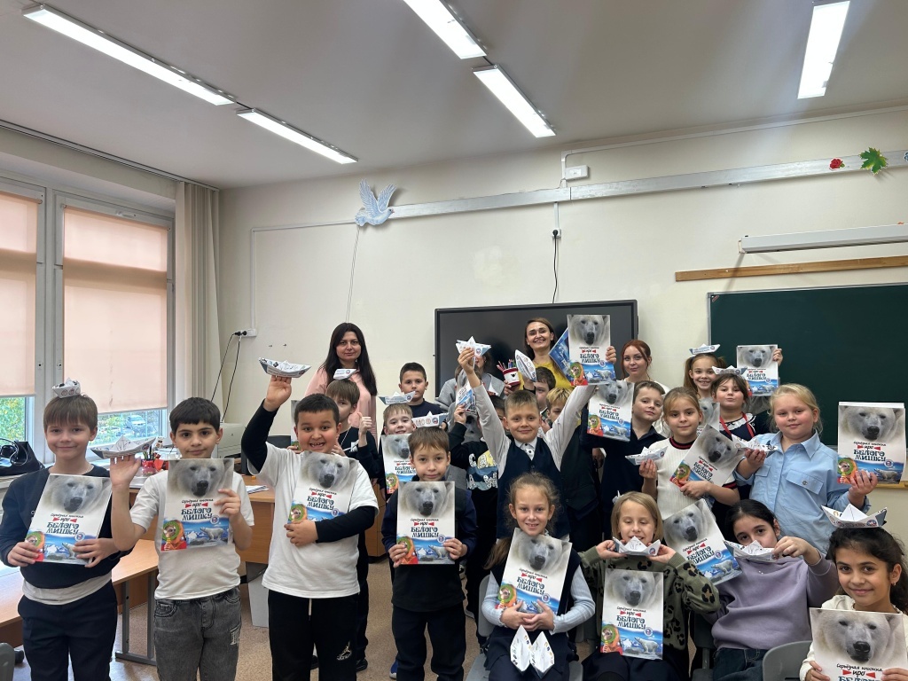 В Москве золотая осень, а мы едем на север столицы, чтобы рассказать ребятам про Арктику и ее хозяина — белого медведя. Школа № 709 им. Дважды Героя Социалистического труда В.И. Долгих не обычная. Владимир Иванович Долгих — инженер-металлург, много лет отдавший Норильску и очень много сделавший для этого города во второй половине прошлого века. Сегодня традиции уважения Севера передаются детям, который учатся в школе, названной его именем. «Ребята, которые учатся в этой школе, знают про Арктику не понаслышке, старшеклассники много раз ездили в экспедиции: на Таймыре были, в Якутии были, ездили в Архангельск и даже на настоящем ледоколе «Диксон» бывали», — делится с нами социальный педагог школы Лариса Геннадьевна Склерук, пока провожает до кабинета, где нас уже с нетерпением ожидают тридцать пар любопытных глаз. Мы знакомим ребят с «Серьезной книжкой про белого мишку», и не просто разговариваем про белого медведя, белый мишка и нерпы оживают на страницах книги и это всегда приводит в в