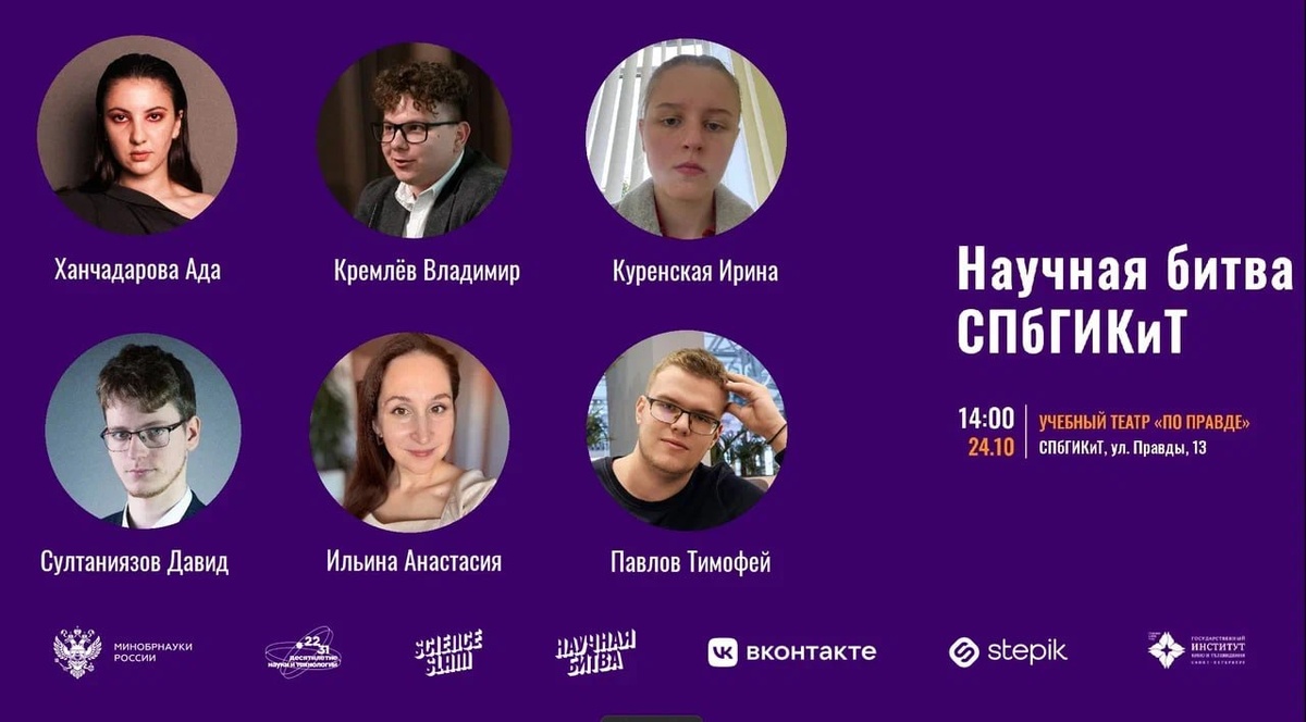 Первая Научная битва ГИКИТ совсем скоро! 🧪 Перед зрителями предстанут 6 учёных, которые расскажут зрителям о своих исследованиях в области кино и телевидения. Каждый «слэмер» умеет рассказать о сложном научном эффекте простыми словами 🧪 Обязательно пройди короткую регистрацию на мероприятие по ссылке 📅 24 октября в 14:00 📍Учебный театр ГИКИТ Зрители выбирают самого интересного спикера. Приходи — твой голос может быть решающим!