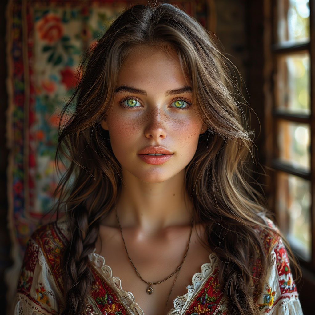 Марьяна была невысокой, с тёмными, как ночь, волосами и пронзительно-зелёными глазами. Она носила простые льняные платья, украшенные вышивкой, и чаще всего ходила босиком, словно ей было приятно касаться земли босыми ступнями.