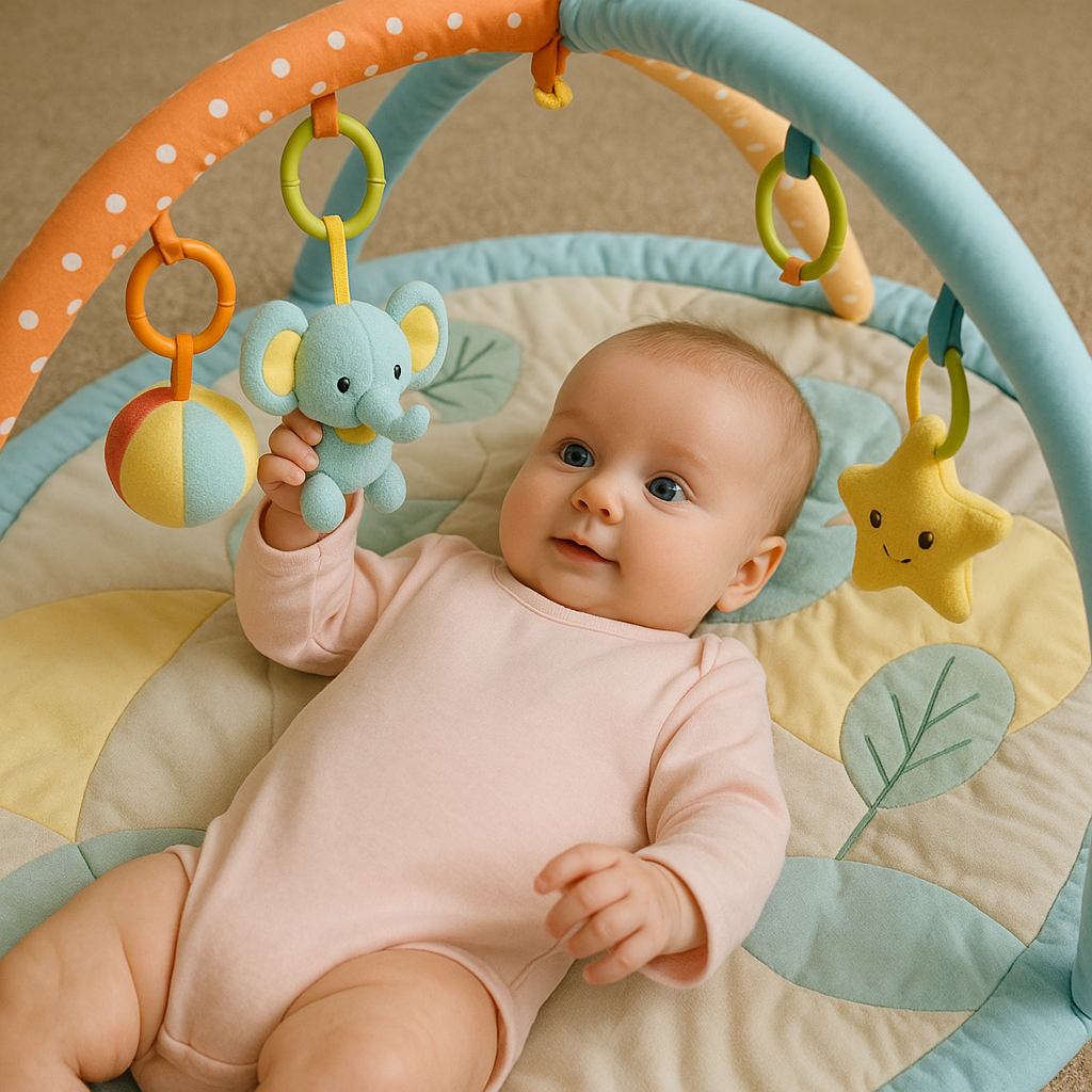 Если вы думаете, что в доме с тремя детьми можно спокойно попить кофе — вы, конечно, ошибаетесь, но мечтать не вредно. Было раннее утро, муж уже ушёл на работу, старшие строили башню из коробок от каш, а я пыталась совместить грудное вскармливание с проверкой отчёта по таргету. И тут — снова эта тишина. Знаете, не тревожная, а такая… магическая. Даша лежала под дугой игрового коврика и... разжала кулачки. Тянется. Хватает. Попадает. И в рот! Я стою, держу ноутбук на одной руке, на второй — Дашину бутылочку, и понимаю: это. он. момент. Я буквально схватила телефон (вдохновлённая её хватательным рефлексом!) и стала гуглить, что происходит. Так я наткнулась на статью про развитие моторики у малышей. Всё совпало: от "разжимания кулачков" до "случайного попадания по подвесной игрушке". Оказывается, то, что я считала случайностью, — важнейший этап развития. Мне стало так тепло. Потому что в этой повседневной рутине я вдруг увидела — рост. Настоящий. Прогресс. И да, одна игрушка, подвешенная