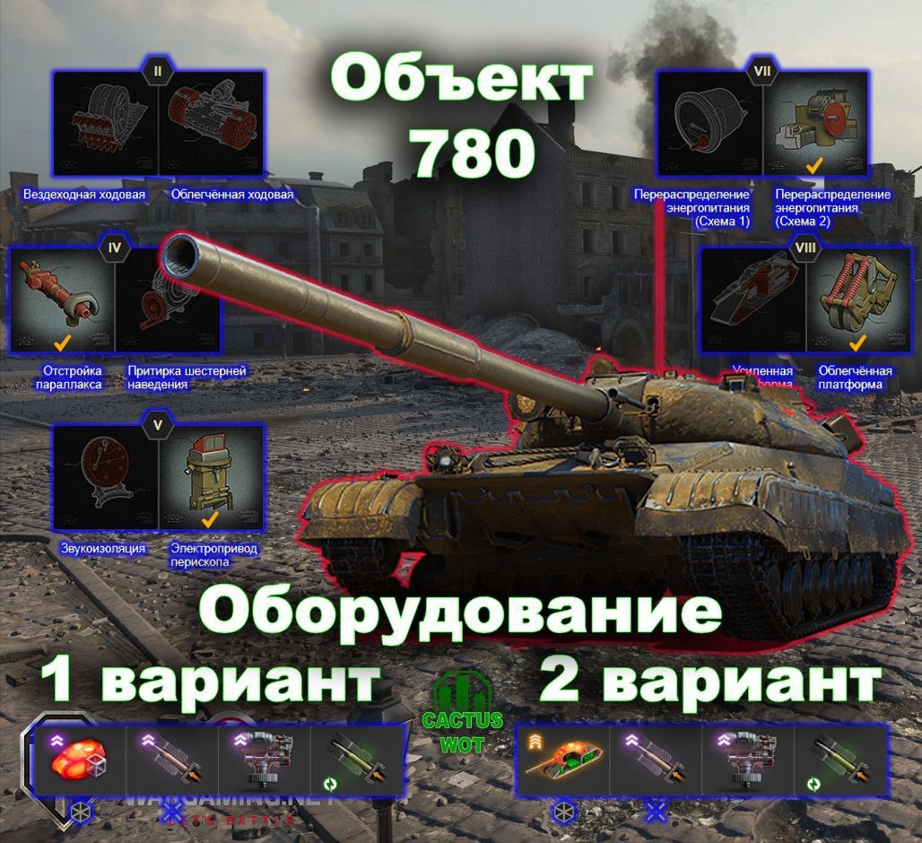 ➿Объект 780 ⚗️ Тяжелый танк прорыва 10 уровень. 🚀Оборудование и полевая модернизация на скрине🔼 ➕Плюсы танка хороший разовый урон; хорошая стабилизация и точность; не плохая броня спереди. ➖Минусы танка частые повреждения баков и БК; слабое бронирование бортов; слабая командирская башенка; долгая перезарядка. Нужно больше инфы? ⬇️⬇️⬇️⬇️⬇️⬇️⬇️⬇️ #базазнаний@CactusWOT #Объект780@CactusWOT #миртанков