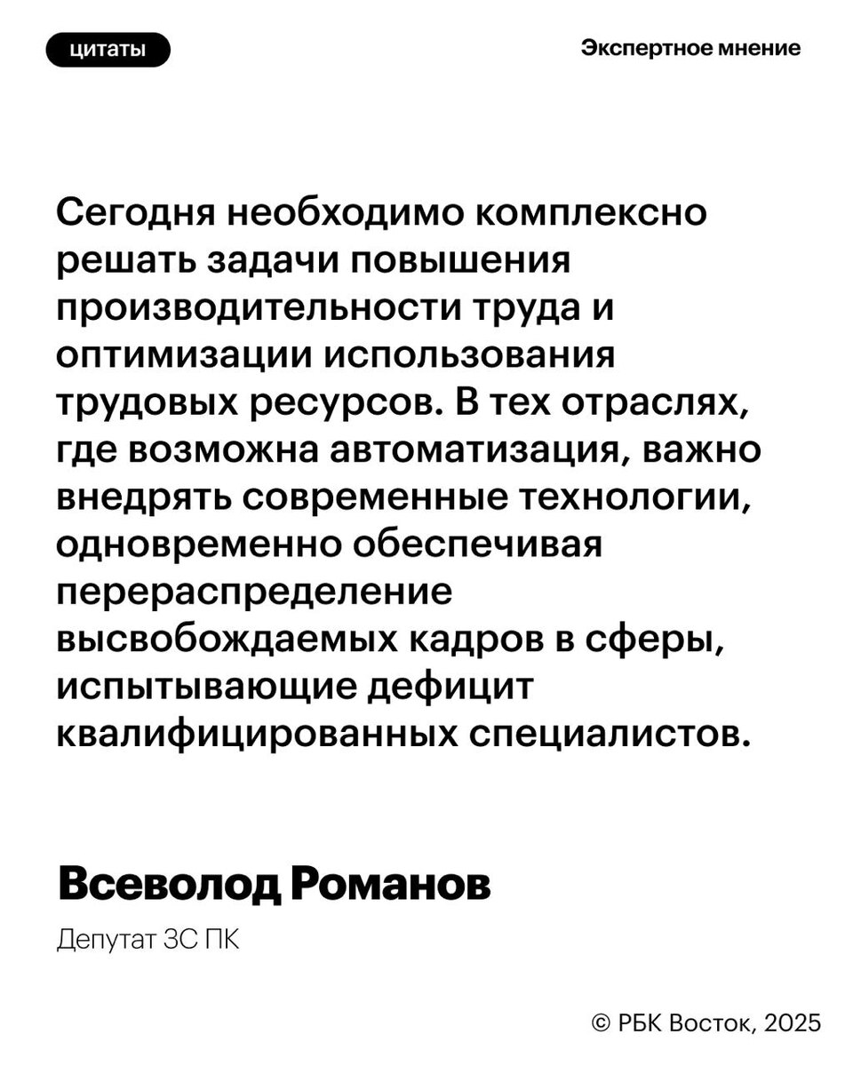 💬 В тех отраслях, где возможна автоматизация, важно внедрять современные технологии, одновременно обеспечивая перераспределение высвобождаемых кадров в сферы, испытывающие дефицит квалифицированных специалистов, считает депутат ЗС ПК Всеволод Романов По его словам, такой сбалансированный подход позволит решить проблему кадрового дефицита, а роботизация ключевых производственных процессов станет основным драйвером роста производительности. 😃Подписывайтесь на РБК Восток