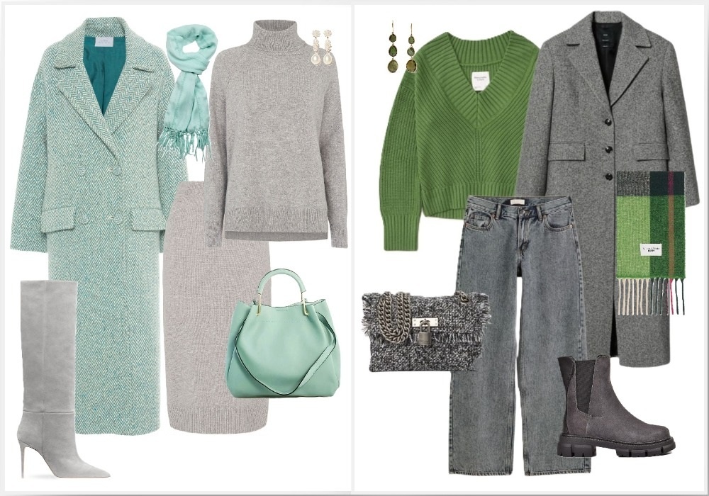 Серый и зелёный - цвета, которые подходят многим, но важно контролировать область применения. Тёмные оттенки зелёного визуально стройнят, а светлые серые тона добавляют лёгкости. Для классического стиля лучше выбирать более сдержанные оттенки и четкие линии, для повседневного - свободные фасоны и объёмные силуэты.
