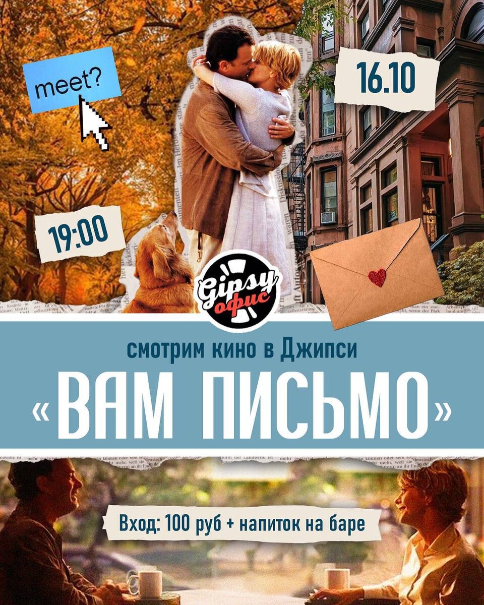 Кинопросмотр романтической комедии с Джо Фоксом и Кэтлин Келли «Вам письмо» 🗓️ 16 октября 19:00 📍gipsy офис Два врага в реальной жизни… И двое влюблённых в переписке. Что будет, когда они наконец узнают правду? Приходите на трогательную и остроумную историю о любви, книгах и маленьких чудесах, которые случаются, когда мы меньше всего их ждём. 🏷️ 100₽+ любой напиток за баром Бронирование мест: @oyanilina #16октября25@culturnik