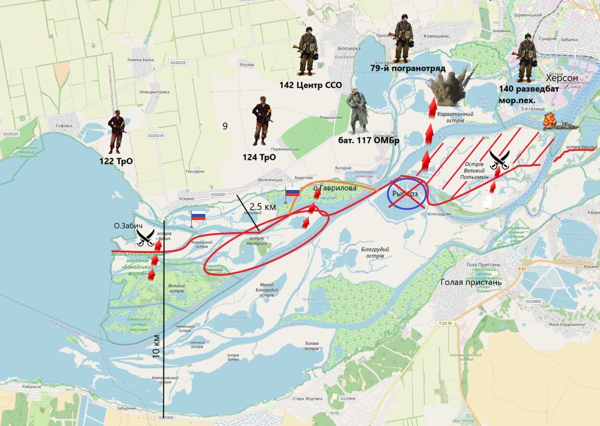 В ответ на пост Херсон. Бои неместного значения Схема ноября 2024 года. Наряд сил противника изменился в сторону уменьшения, так что можно фигурки вражеских подразделений уже не смотреть Важные изменения за год. Все острова дельты Днепра наши, именно дельты. ВС РФ целенаправленно выносят прибрежные укрепления с л/с и отодвигают противника от береговой линии. Это тоже факт подтвержденный обоими сторонами. И понятно, с какой целью это делается. Из свежих неофициальных новостей - мы зашли на Карантинный остров, входящий в состав российского областного центра Херсона. Что примечательно, 12 марта 1943 года с западного направления в город Херсон с Карантинного острова ворвались штурмовые группы 295-й дивизии, незаметно переправившись через Днепр. С другой стороны в город ворвались десантники будущего дяди Васи (Маргелова). А еще через сутки, 13 марта город был освобожден. схемы и карты