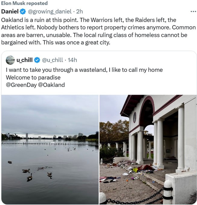 'Oakland is a ruin, the ruling class of homeless cannot be bargained with' — Musk reposts