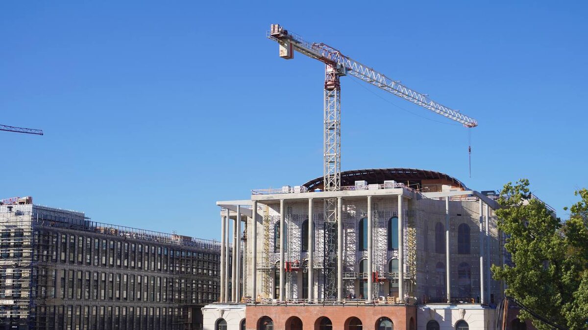 Готовность Дворца танца Бориса Эйфмана достигла 60% Строительная готовность Дворца танца Бориса Эйфмана в судебном квартале Санкт-Петербурга достигла 60%. Монолитные работы полностью завершены, специалисты проводят монтаж инженерных систем, металлических конструкций, устройство кровли и фасада, отделочные работы, сообщил заместитель председателя правительства РФ Марат Хуснуллин в своем Telegram-канале. ⚪️В настоящее время ведется согласование дизайн-проектов большого зала, малой сцены театра и парка «Фуэте». По словам Хуснуллина, парк визуально и концептуально продолжит архитектурные идеи Дворца. На стройплощадке задействовано более 1100 рабочих. 📷: t.me/mkhusnullin 📰 Подпишитесь на «Ведомости Северо-Запад»