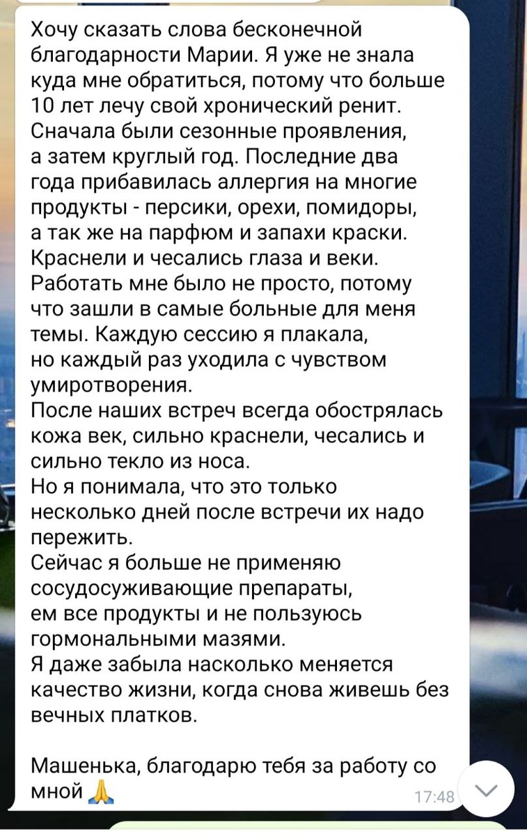 Аллергические проявления ушли и изменилось качество жизни. Клиентка забыла о сосудосуживающих препаратах и больше не носит с собой платки.