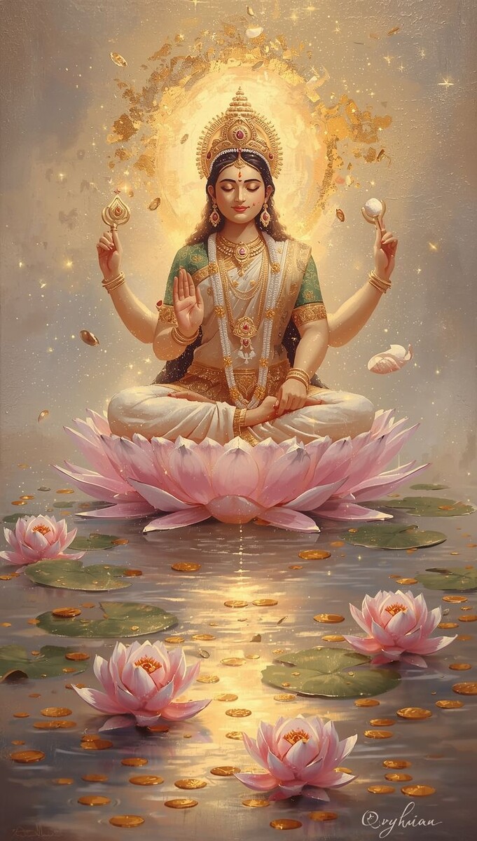 - В двух из них она держит лотосы, а другими показывает мудры (жесты руками), благословляющие счастьем и процветанием.