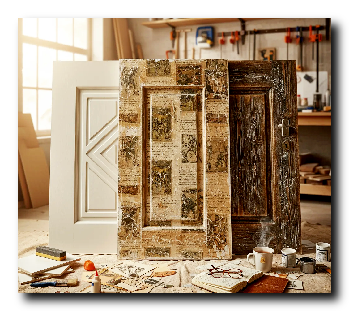 - Финиш: После высыхания – 3-4 слоя акрилового лака. Каждый слой с промежуточной шлифовкой мелкой шкуркой. Результат? Уникальная дизайнерская вещь! Можно сделать дверь с картой мира, с ретро-афишами, да хоть с портретом тещи!
