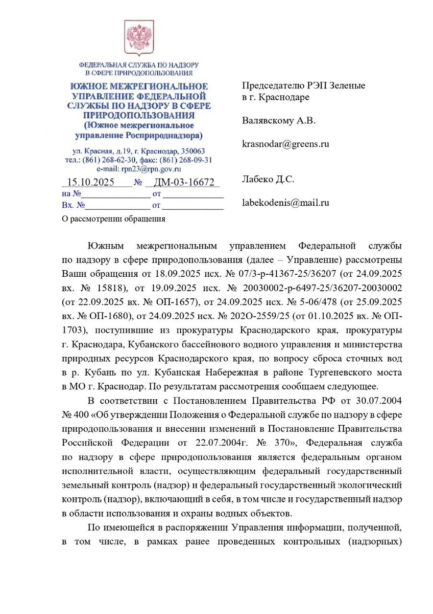 Вчера поступил ответ из Южного межрегионального управления Росприроднадзора на обращение «ЗЕЛЁНЫХ» по факту сброса загрязняющих веществ в реку Кубань в районе Тургеневского моста на въезде в Краснодар. Напомним, 17 сентября местное отделение партии обратилось в прокуратуру после многочисленных жалоб жителей на загрязнение реки. 24 сентября прокуратура передала обращение партии в Южное межрегиональное управление Росприроднадзора. Специалисты Центра лабораторного анализа и технических измерений во Южному Федеральному округу по Краснодарскому краю провели анализ сточных вод, поступающих в Кубань через ливневую канализацию. Лабораторные исследования выявили превышения загрязняющих веществ: нефтепродуктов, иона аммония, фосфат-иона, АПАВ, железа, цинка, меди, алюминия, марганца. Также превышен показатель полного биохимического потребления кислорода. Проверка Росприроднадзора продолжается. «Проблема с загрязнением реки в Краснодаре стоит крайне остро. Практически весь старый район города не