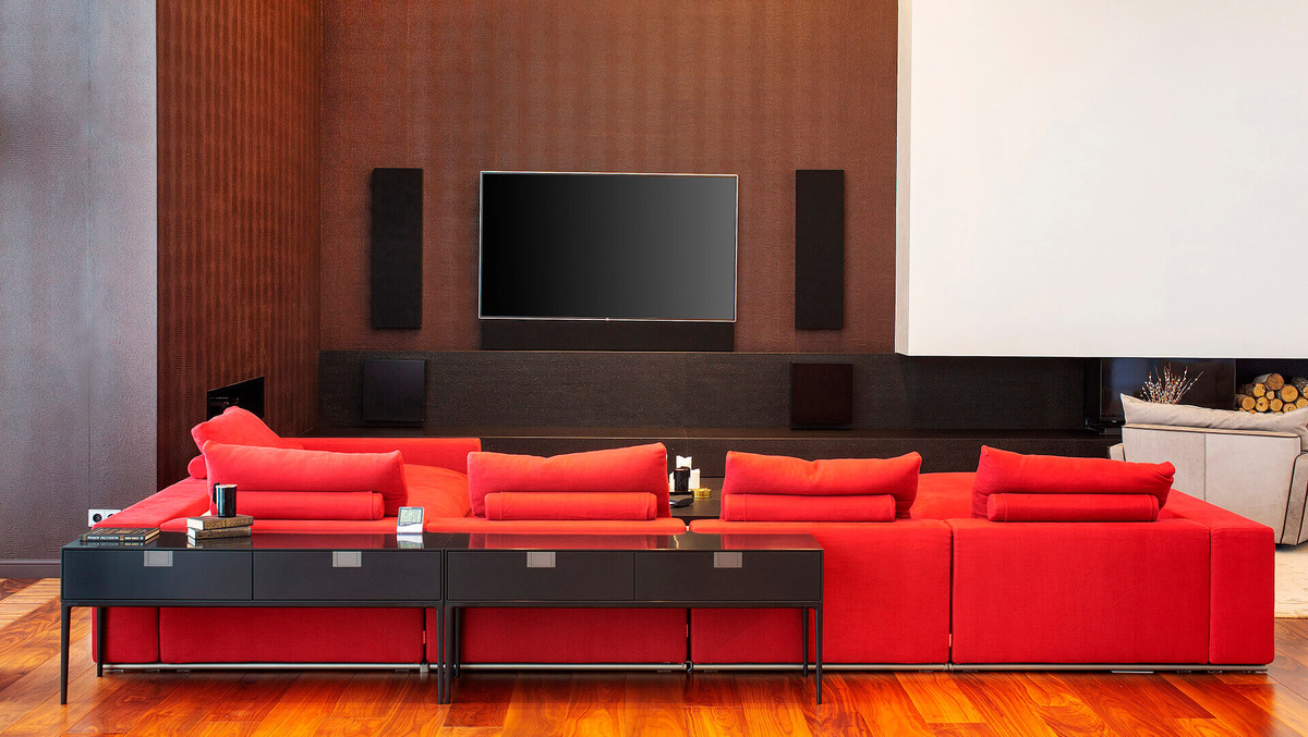 Название проекта: Паприка Тип: Частный дом Место: Новосибирск, Россия Авторы: СВЕТЛАНА МИЛЯЕВА & ARTINSTALL Звук: 7.2 Этот особняк находится в Новосибирске. Интерьер в стиле минимализм демонстрирует роскошь сдержанной элегантности. Помещение с высокими потолками и большими окнами — непростая задача для качественного звучания. Но для этого помещения была подобрана своя совершенно особенная система, которая не только справилась с объемом гостиной, но и дополнила эстетическую составляющую. Фронтальные акустические системы, а также сабвуферы расположены на фронтальной стене. Не сразу можно понять, где расположена тыловая акустика. Решение простое и часто применяемое на практике – спрятать тылы за потолочное пространство. Акустический гриль подобран в тон потолка, при этом акустические системы минимально заметны. Для управления системой домашнего кинотеатра был разработан специальный интерфейс для планшета iPad. Ниша с оборудованием выполнена в стене, в зоне доступа просмотра. Решение сдела