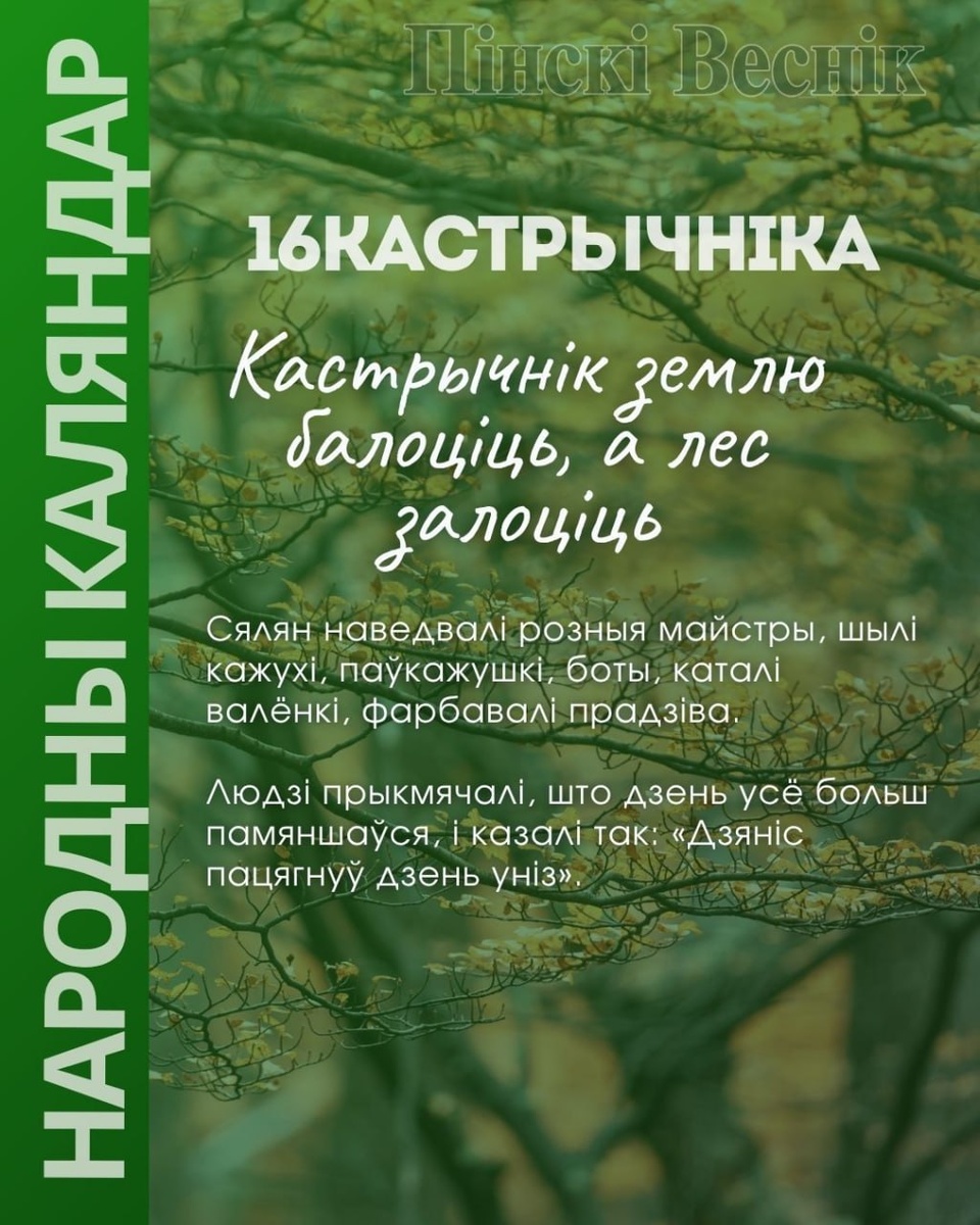 1️⃣1️⃣1️⃣1️⃣5️⃣1️⃣2️⃣ 1️⃣1️⃣1️⃣3️⃣1️⃣5️⃣1️⃣1️⃣ 🔵16 кастрычніка 🏷Сялян наведвалі розныя майстры, шылі кажухі, паўкажушкі, боты, каталі валёнкі, фарбавалі прадзіва. ▶️Людзі прыкмячалі, што дзень усё больш памяншаўся, і казалі так: «Дзяніс пацягнуў дзень уніз». #народныкаляндар 📍📍@Пинский Вестник ЮТУБ | САЙТ| ИНСТ | ВК | ОК | ФЕ | TikTok Прислать новость