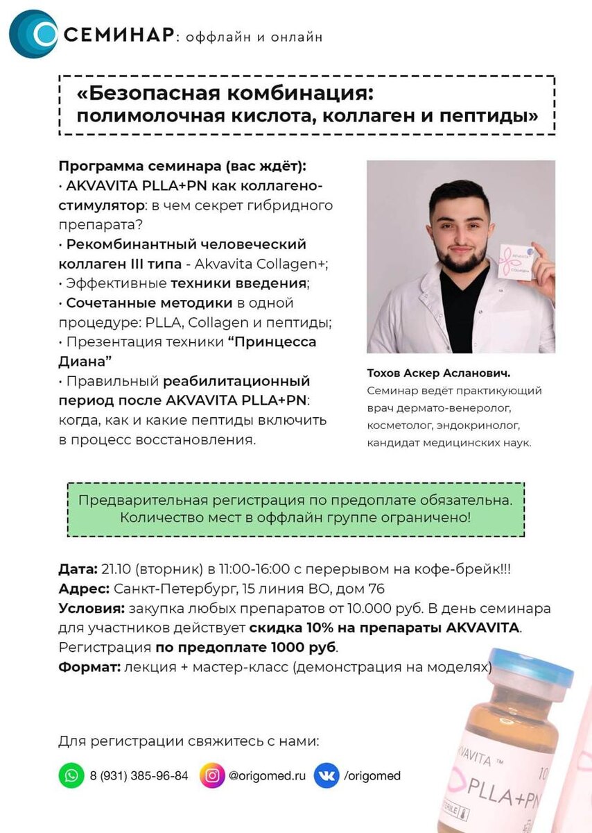 В ответ на пост Коллеги, уже на следующей неделе пройдет долгожданный семинар по AKVAVITA на тему: «Безопасная комбинация: полимолочная кислота, коллаген и пептиды» 🔥 Пройдёт он 21.10 (вторник) в 11:00. 🏠 Проходит оффлайн в Петербурге + трансляция в высоком качестве для врачей из регионов 💕 👩⚕️ Спикер - Тохов Аскер Асланович - практикующий врач дермато-венеролог, косметолог, эндокринолог, кандидат медицинских наук. 🔹 Тема: « Безопасная комбинация: полимолочная кислота, коллаген и пептиды » 🔹 На семинаре вас ждёт (программа семинара) : * AKVAVITA PLLA+PN как коллагено-стимулятор: в чем секрет гибридного препарата? * Рекомбинантный человеческий коллаген III типа - Akvavita Collagen+; * Эффективные техники введения; * Сочетанные методики в одной процедуре: PLLA, Collagen и пептиды; * Презентация техники "Принцесса Диана" * Правильный реабилитационный период после AKVAVITA PLLA+PN: когда, как и какие пептиды включить в процесс восстановления. Для регистрации напишите вашему мен