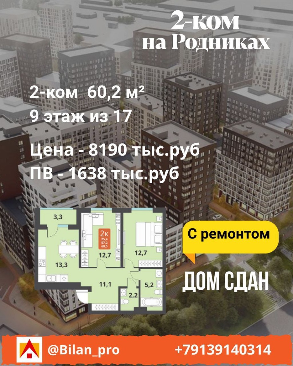 2-ком на Родниках На 16.10.2025 г Цена 7530 тыс.руб Без ремонта Есть 4 и 5 этаж Но можно найти с и ремонтом Дом сдан Скидка участникам СВО - 3% За подробностями, пишите @LBilan #новостройки@Bilan_pro #квартира@Bilan_pro #риэлтор@Bilan_pro #2ком@Bilan_pro