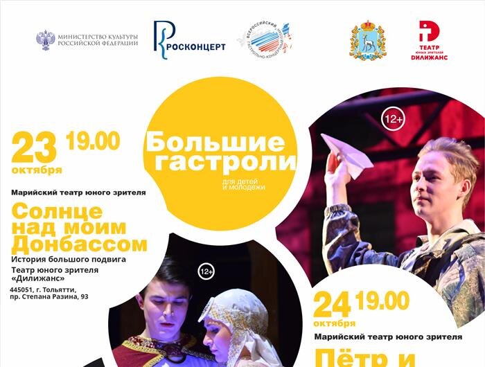 С 23 по 25 октября в Тольятти пройдут "Большие гастроли" Марийского театра юного зрителя, организованные РОСКОНЦЕРТом согласно Всероссийскому гастрольно-концертному плану Министерства культуры РФ. На сцене театра юного зрителя "Дилижанс" покажут спектакли "Солнце над моим Донбассом", "Петр и Феврония" и "Сказки дядюшки Римуса". Министр культуры РФ Ольги Любимовой говорит: "Главная цель Всероссийского гастрольно-концертного плана - познакомить как можно больше жителей страны с творчеством национальных коллективов и театров. Ежегодно к проекту присоединяются новые участники, и мы безумно рады, что наша творческая семья постоянно растет. Так наши уникальные культурные традиции, музыкальные и театральные школы не только сохраняются, но и обретают новых поклонников по всей России". Программа: 23 октября, 19:00 - "Солнце над моим Донбассом" (12+), 1 час 30 мин. (без антракта). Пронзительная военная драма, основанная на одноименной пьесе Валерия Боталова, получившей признание Гильдии драматур