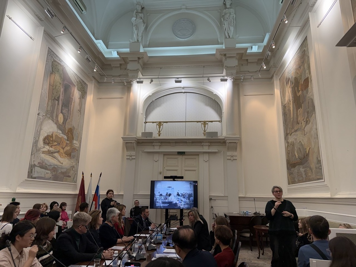 Китаянка, аспирантка РГХПУ им. Строганова выступила с докладом "Интерактивный класс. Местный опыт и визуальные инновации в религии, истории и культуре провинции Шаньси, Китай". Она рассказала много интересного о «перевернутом» обучении в Китае на примере культуры провинции Шанси и о том, как визуальные символы переходят в повседневную жизнь и трансформируются, превращаясь в персонажи, изображения.
