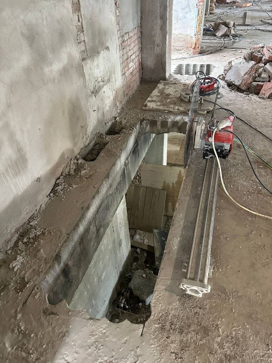 Методом алмазного сверления и резки сделали проемы в плите перекрытия для монтажа инженерных систем