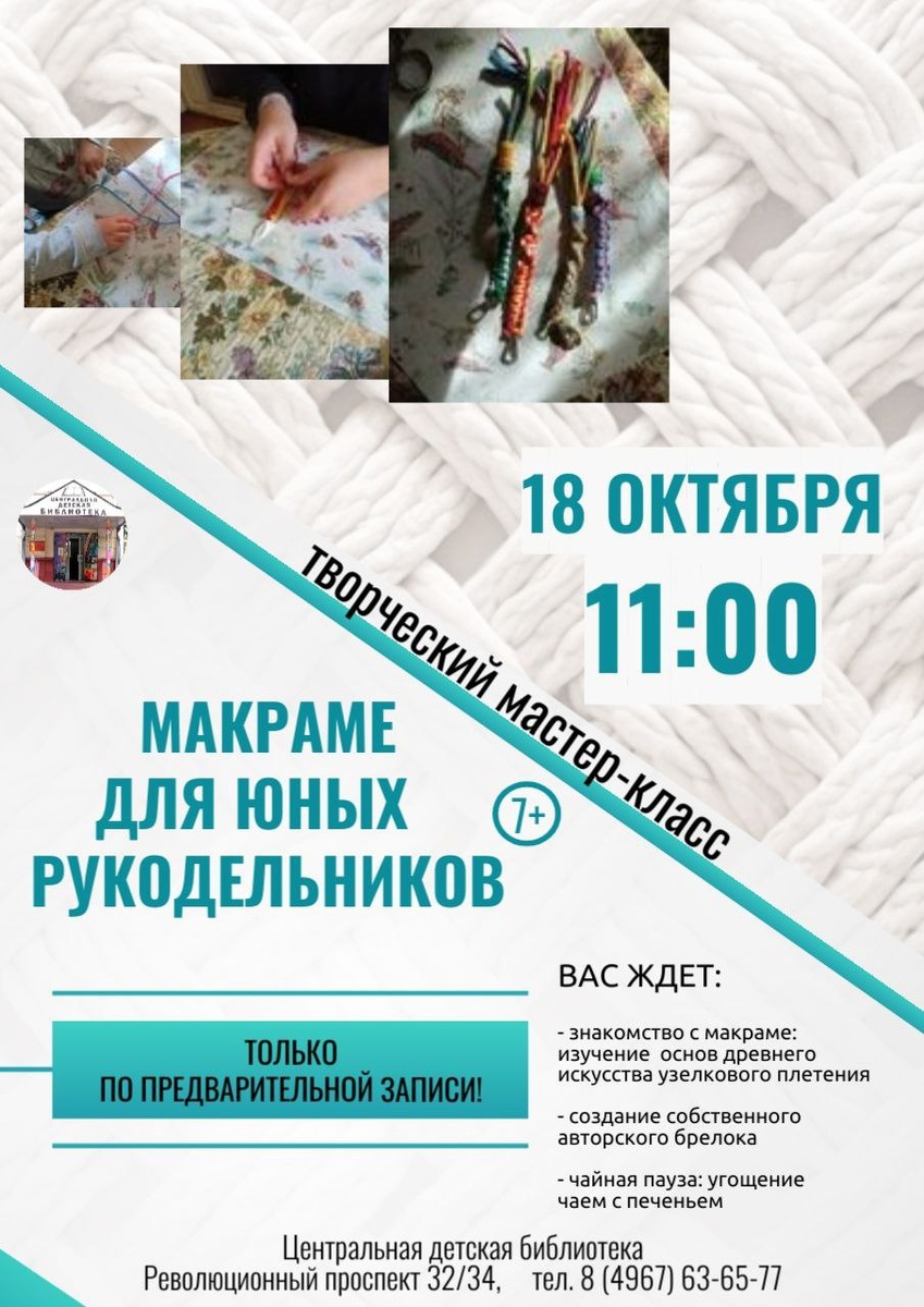 ✨ Мастер-класс по макраме для детей 7-10 лет ⛓️Создадим брелок в технике макраме, а ещё будет чайная пауза: угощение чаем с печеньем. ‼️Материалы предоставляются. Количество мест ограничено. 🔴 ПРЕДВАРИТЕЛЬНАЯ ЗАПИСЬ ПО ТЕЛЕФОНУ ОБЯЗАТЕЛЬНА! 8 (4967) 63-65-77 📆 18.10.2025 🕒 11:00 🏢 Центральная детская библиотека 📍 г. Подольск, Революционный проспект д. 32/34 ⭐Поддержать канал голосом 💰 Вакансия - курьер в Подольске ✅ Мероприятия Подольск https://dzen.ru/id/66ed500f7b5671493eca3fd6 http://vk.com/podolsk_events http://dzen.ru/podolsk_events